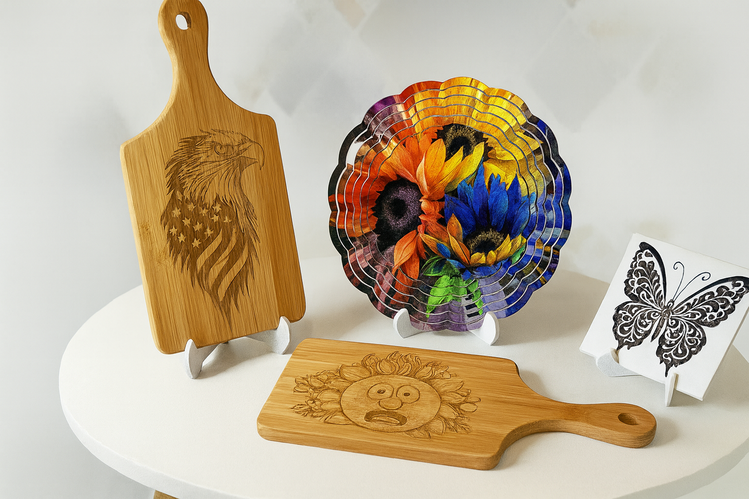 Where Color, Craftsmanship, and Creativity Meet — Explore Our Sublimation Wind Spinners, Engraved Tiles, and Custom Wood Boards.